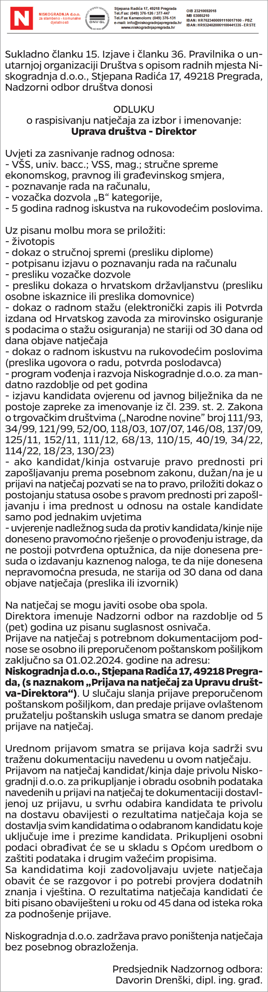 Nadzorni odbor Niskogradnje d.o.o. objavio je dana 17.01.2024. godine u Večernjem listu natječaj za izbor i imenovanje Uprave Društva – Direktora. Rok za podnošenje molbe je 15 dana od dana objave, a uvjete i dokumente nužne za podnošenje prijave možete pogledati u Odluci: